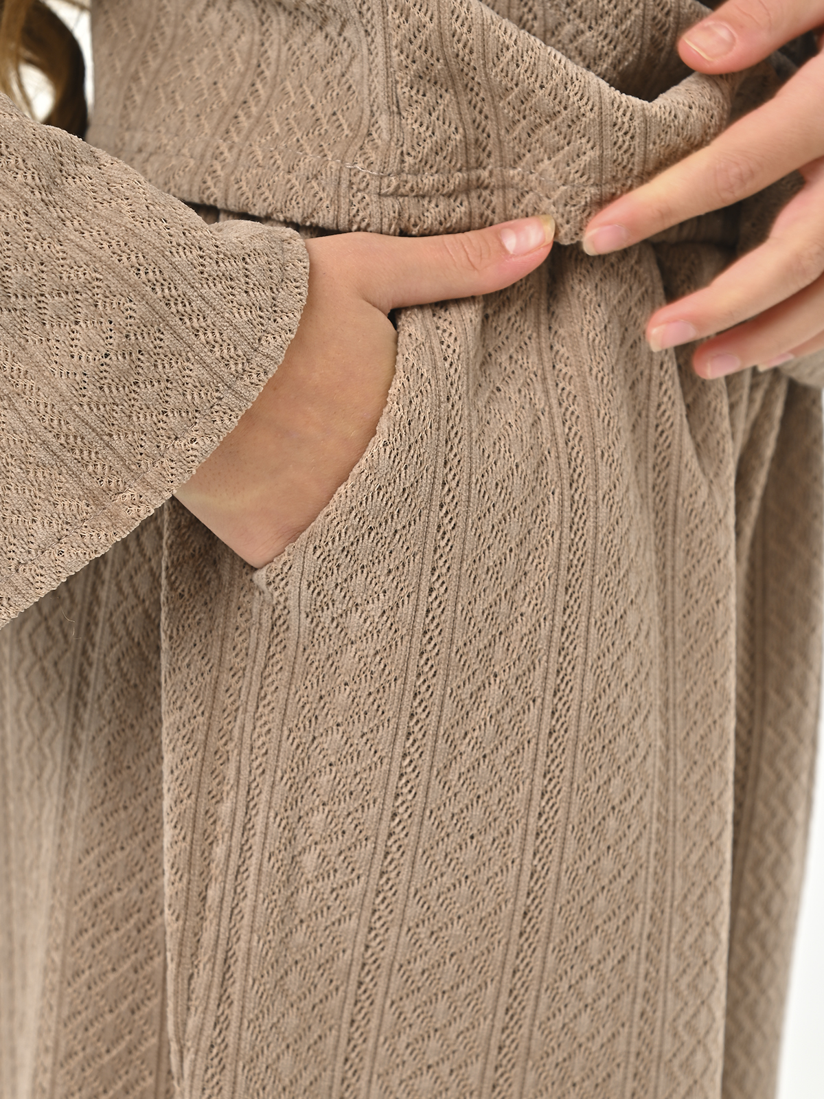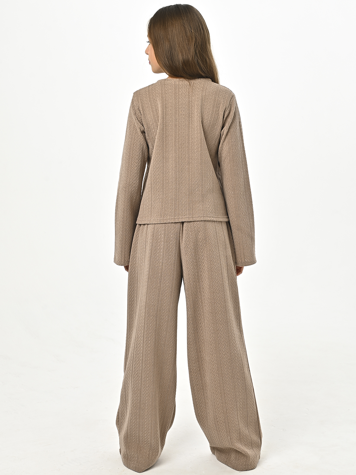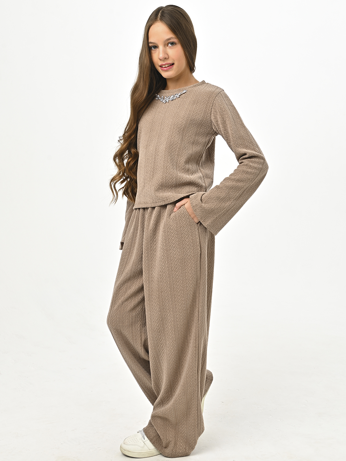 • Брюки и кофточка выполнены с рельефным узором (косички)