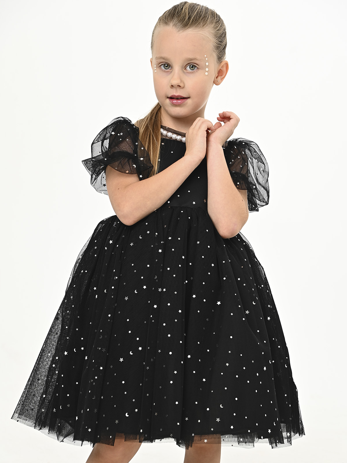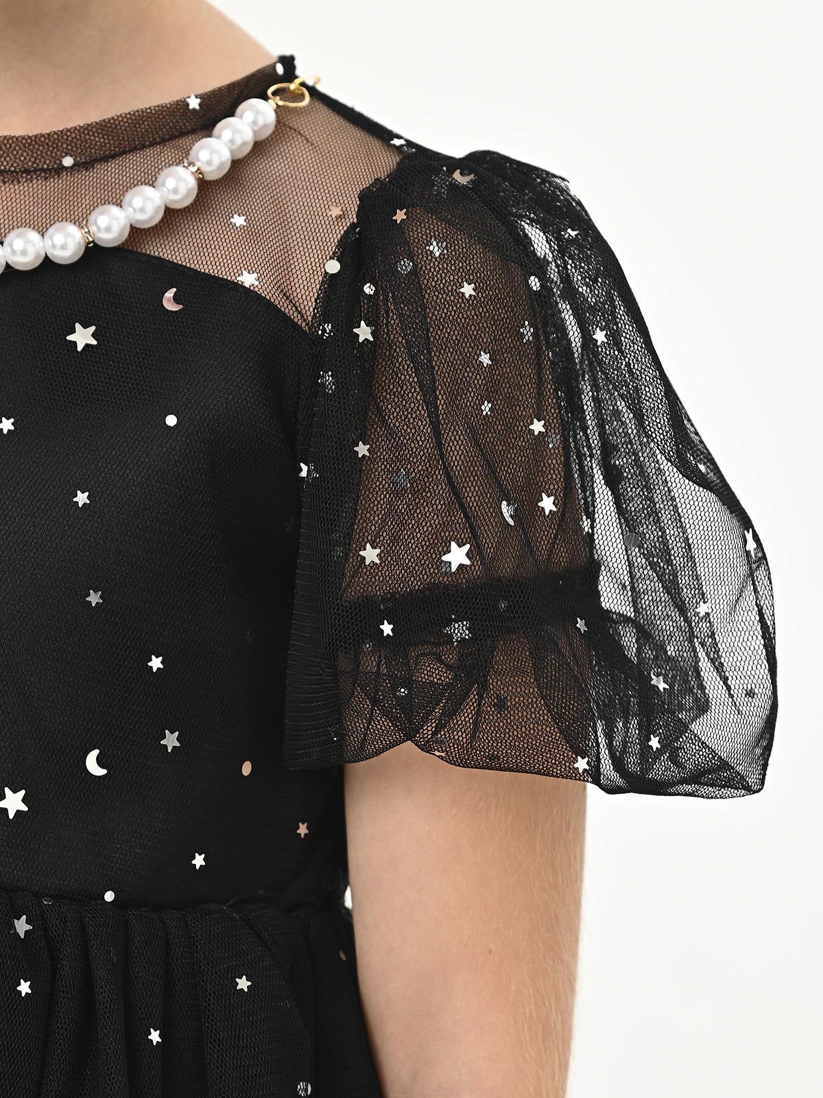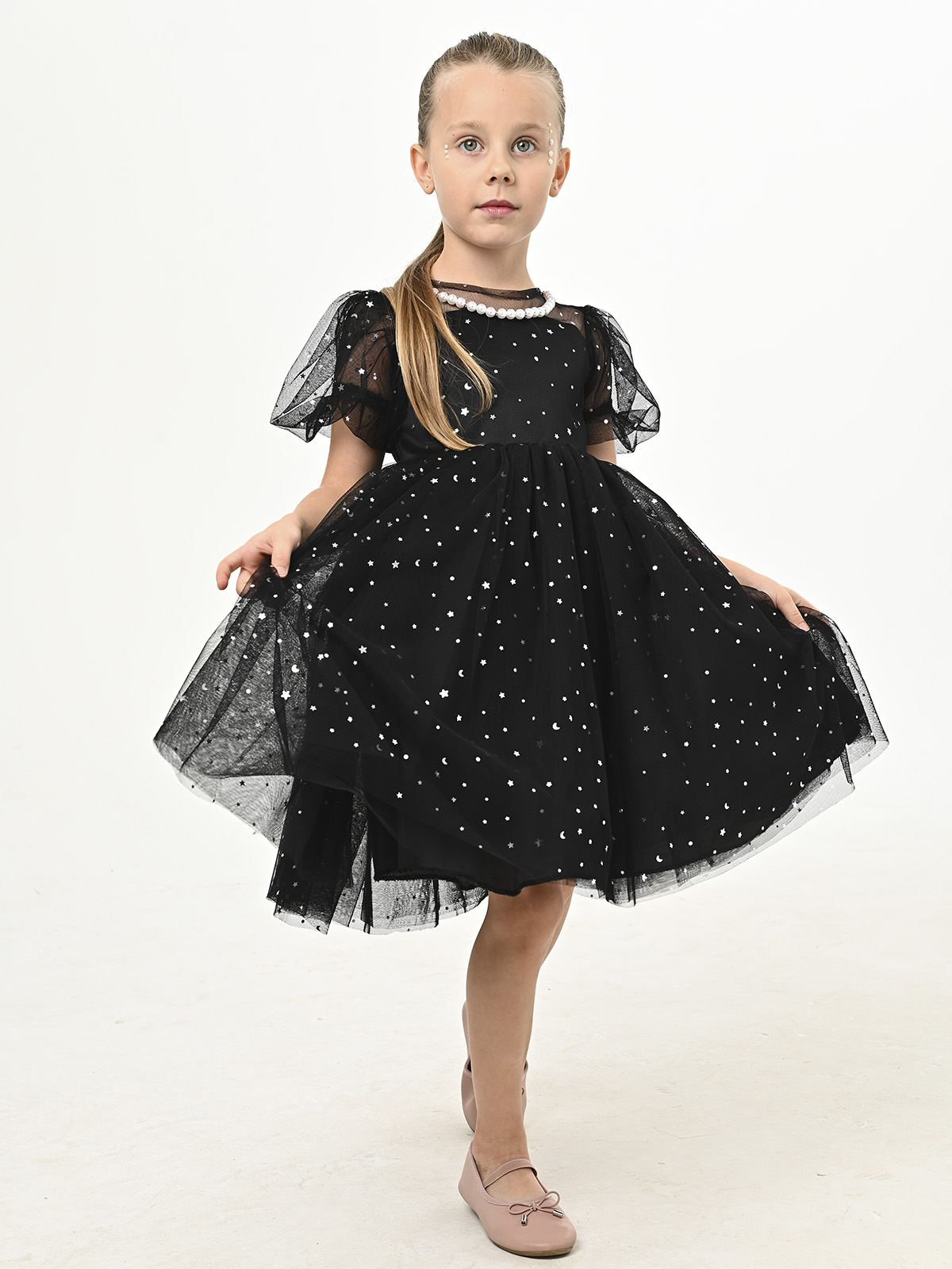 • Объемная, пышная, многослойная юбка из фатина с элементами в виде звезд, месяцев и горошка