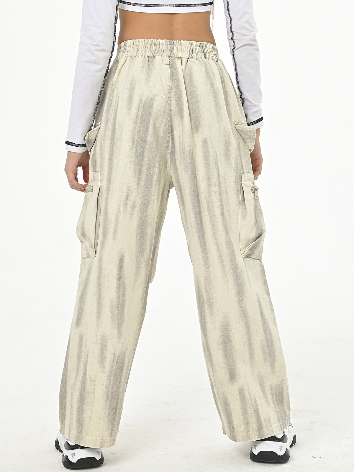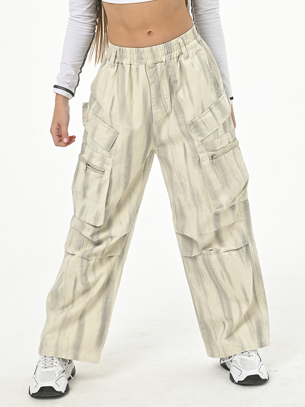• Джинсы имеют удобную резинку сверху, а также карманы по бокам и карманы на молнии в области колен, под боковыми карманами расположена обманка в виде карманов