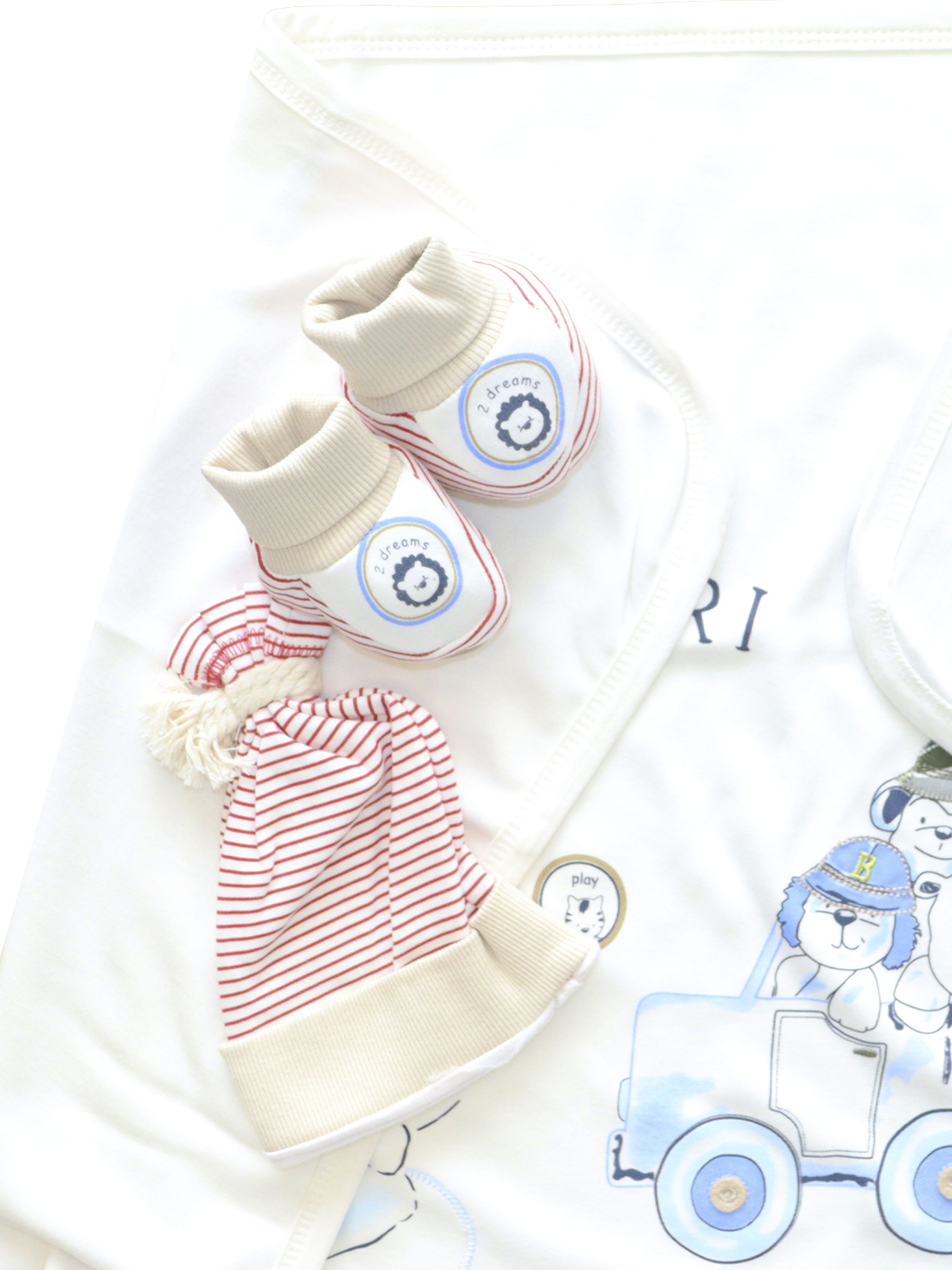 Комплект состоит из покрывала, шапочки и носочков
